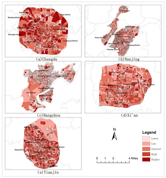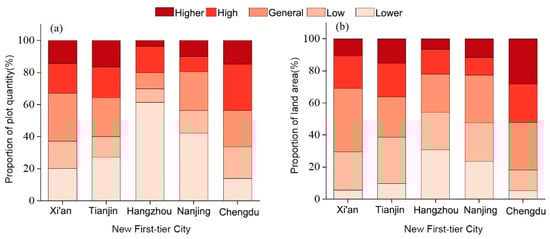In Figure 11, the similarities in land use function mix among the five new first-tier cities are as follows: (1) In the proportion of the number of land plots with varying degrees of land mix to the land area, the number of land plots with a high degree of land mix to the land area is mostly the smallest part. (2) Chengdu, Tianjin, and Xi’an show a clear pattern of dispersion in the functional mix of the five classes of land use, among which Chengdu and Tianjin have a higher overall functional mix of land use, and Xi’an has a lower overall functional mix of land use. (3) Nanjing and Hangzhou both have a low degree of functional mixing due to a relatively significant amount of scenic spots and cultural heritage sites in their urban study areas. (4) The plot units with a high and higher degree of mixing only account for about 20% of the study area.