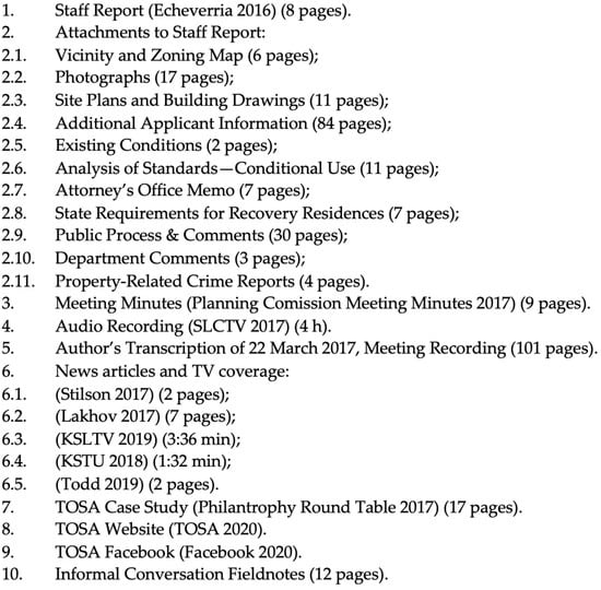 Figure 2 shows the different sources of data that were used to conduct the TOSA case study. This included documents like the staff report, which offered insights into the project and its considerations. The staff report, created by the city for TOSA’s conditional use permit, was analyzed for content analysis [56]. The public report includes all information that is relevant to be able to make an administrative decision, including attachments—site plan drawings, elevations, emails, statements, and letters from the applicant, administrative interpretations, and public comments showing support or disapproval. I examined attachments, such as maps, photographs, site plans, and building drawings, to visually depict the property and its surroundings. To enhance my understanding of the project, we incorporated information and existing condition reports. I also considered regulatory perspectives from documents like the Attorneys Office Memo and State Requirements for Recovery Residences. I sought community perspectives by reviewing public process records and comment records. These valuable resources provided insight into sentiment and concerns surrounding the case.