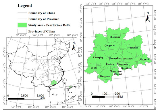 The PRD region, as the pioneering area of China’s reform and opening-up, has garnered significant attention from both the political and academic spheres due to its rapid urbanization [35]. According to the Development Plan, this paper focuses on the crucial area of the PRD composed of Guangzhou, Shenzhen, Zhuhai, Foshan, Jiangmen, Dongguan, Zhongshan, Huizhou and Zhaoqing, radiating across their neighboring cities (Shanwei, Qingyuan, Yunfu, Heyuan and Shaoguan) in PRD, as shown in Figure 2. As one of China’s three major urban agglomerations, the PRD boasts a GDP of CNY 10.78 trillion as of 2021, making it one of the most dynamic and promising regions in China’s economic development. The PRD has made remarkable contributions to China’s economic and social progress. With the implementation of the Greater Bay Area Plan and the transformation of traditional industries alongside the development of high-tech industries, the pattern and efficiency of land use in the PRD have undergone significant changes [36,37]. However, challenges such as population agglomeration, extensive land expansion, and rapid industrialization have posed difficulties in achieving ULHU in the PRD, thereby impeding the region’s high-quality economic and social development [37,38,39]. Consequently, it is crucial to explore strategies for the rational use of urban land, achieve optimal resource allocation, and realize ULHU in the PRD. Analyzing the spatial and temporal patterns of ULHU in the PRD and investigating the driving mechanisms behind ULHU will not only contribute to the sustainable development of cities in the PRD but also enhance the regulatory policies for national land governance.