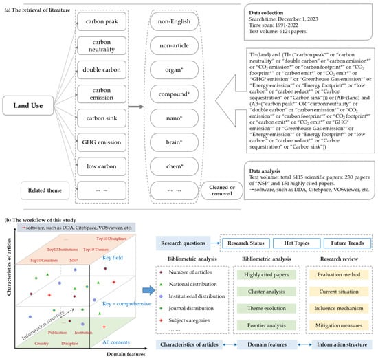 Web of Science (WoS) is one of the most authoritative citation data platforms, which include the Science Citation Index Expanded (SCIE) and Social Science Citation Index (SSCI) databases. There are lots of interdisciplinary, comprehensive and influential international academic journals in this platform. We used several key words for the retrieval of the literature related to land use carbon emission or sink (LUCES), such as title equaled “land” and title equaled “carbon peak*” or “carbon neutrality” or “double carbon” or “carbon emission*” or “CO2 emission*” or “carbon footprint*” or “CO2 footprint*” or “carbon emit*” or “CO2 emit*” or “GHG* emission*” or “greenhouse gas emission*” or “energy emission*” or “energy footprint*” or “low carbon” or “carbon reduce*” or “carbon sequestration” or “carbon sink”; abstract equaled “land” and abstract equaled “carbon peak*” or “carbon neutrality” or “double carbon” or “carbon emission*” or “CO2 emission*” or “carbon footprint*” or “CO2 footprint*” or “carbon emit*” or “CO2 emit*” or “GHG* emission*” or “Energy emission*” or “greenhouse gas emission*” or “carbon sequestration” or “energy footprint*” or “low carbon” or “carbon reduce*” or “carbon sink”. A total of 6214 publications were found (articles from 1991 to 2022 were collected on 31 May 2023, and articles from 2023 were collected on 1 December 2023; in addition, for 2023, articles were considered only up to 1 December 2023). During 1991–2023, a total of 230 publications were collected from Nature (36) as well as its subsidiaries, including Nature Climate Change (37), Nature Communications (39), Nature Food (12), Nature Geoscience (20) and Nature Sustainability (10); and Science (16) and its subsidiaries, including science advances (8) and PNAS (Proceedings of the National Academy of Sciences) (52). The journals mentioned above were collectively referred to as “NSP”, which accounted for more than 90% of the total publications in the journals Nature, Science, PNAS, and their related subsidiaries.