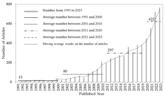 Analysis on the LUCES research found that the cumulative number of articles was 6115 (Figure 2), with an annual publication of 1 in 1991 to 766 in 2023. According to the moving average, we found that the number of published articles on LUCES research first showed a steady upward trend, then a fluctuated upward trend, and finally showed a rapid upward trend. Specifically, the first stage (1991–2000) was an initial stage (the number of publications per year was small), with a cumulative number of 152 (the annual average was 15), which accounted for only 2.49% of the total publications. The second stage (2001–2010) was the rising stage of fluctuation, with the cumulative articles of 801 (the average was 80), which accounted for 13.10% of the total. The third stage (2011–2019) also saw a rising stage of fluctuation, with the cumulative article number of 2673 (the average was 297), which accounted for 43.71% of the total. The fourth one (2020–2023) was a rapid growth period, with the cumulative number of 2489 (the average was 622), which accounted for 40.70% of the total. The number of cumulative articles in the third stage and fourth stage was 16.59 and 15.38 times higher than that in the first one, respectively. From the perspective of overall trend of published articles in the research on LUCES, although there has been a downward trend in some years (such as 2001, 2011 and 2017) compared to the previous year, it has shown varying degrees of growth trends over last 33 years. It revealed that this research field has been widely recognized and concerned in recent years.
