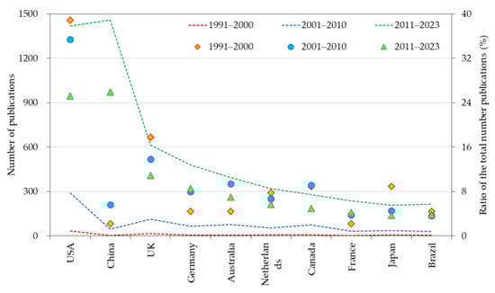 Firstly, based on the data from the WoS platform, publications in LUCES research were from 138 countries/territories, and the top 10 countries, with the ratio 64.83% of the total, included the USA, China, the UK, Germany, Australia, Canada, Netherlands, France, Japan and Brazil, as shown in Figure 3. Among them, the cumulative number of publications from the USA ranked first during 1991–2000 and 2001–2010, accounting for 38.89% and 35.41% of the total top 10 countries; from 2011 to 2023, the cumulative number of articles published by China ranked first, accounting for 25.59% of the total. Overall, in the early stage, the USA dominated this research field, and in the later stage, China gradually moved towards the dominant position in this research field.