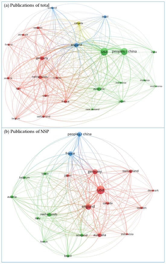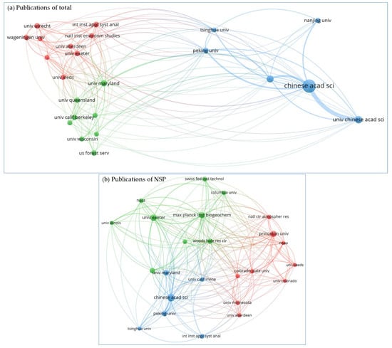 The institutional cooperation network on LUCES research. (a) Publications of total; (b) publications of “NSP”.
