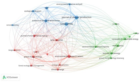 This work drew the journal citation network diagram on LUCES research (Figure 6). It was found that there were four clusters in this research field, based on total link strength of cooperation network. Cluster 1 (red one, 10) included Environmental Research Letters, Agriculture Ecosystems & Environment, Global Change Biology, Land Use Policy, Biogeosciences, Forests, Forest Ecology and Management, Ecological Economics, Journal of Environmental Management and Climatic Change. Cluster 2 (green one, eight) included Energy Policy, Environmental Science & Technology, Biomass & Bioenergy, Renewable & Sustainable Energy, Applied Energy, Energies and Global Change Biology Bioenergy. Cluster 3 (blue one, seven) involved in Journal of Cleaner Production, Land, Science of the Total Environment, Sustainability, Ecological Indicators, Environmental Science and Pollution Research and Remote Sensing. On the whole, we found that Journal of Cleaner Production, Energy Policy, Sustainability and Environmental Research Letters were four journals with an important leading position in LUCES research, based on the total link strength.