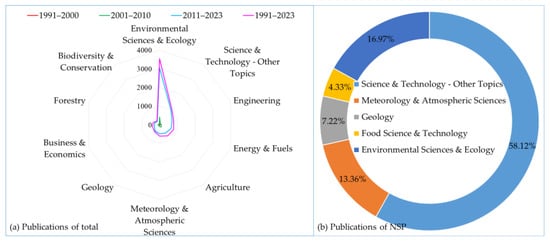 Firstly, total publications in LUCES research were from 83 subject categories. As shown in Figure 7a, the top 10 subject categories were mainly focused on environmental sciences and ecology, science and technology—other topics, engineering, energy and fuels, agriculture, meteorology and atmospheric sciences, geology, business and economics and forestry, as well as biodiversity and conservation, from different periods. The articles related to the top 10 subject categories, which accounted for 82.34% of the total during 1991–2023. In addition, it pointed out that these subject categories, e.g., science and technology—other topics, engineering, environmental sciences and ecology, and environmental sciences and ecology, which related to LUCES research, increased the fastest, by 11.49, 7.45, 7.12 and 6.38 times compared to the period between 2011–2023 and 2001–2010, separately. Secondly, LUCES research from “NSP” were only from five subject categories, including science and technology—other topics, meteorology and atmospheric sciences, geology, food science and technology, as well as environmental sciences and ecology (Figure 7b). Overall, regardless of the subject categories from the total publications or from “NSP” publications, we found that science and technology—other topics, meteorology and atmospheric sciences, geology and environmental sciences and ecology were the main categories of LUCES research.