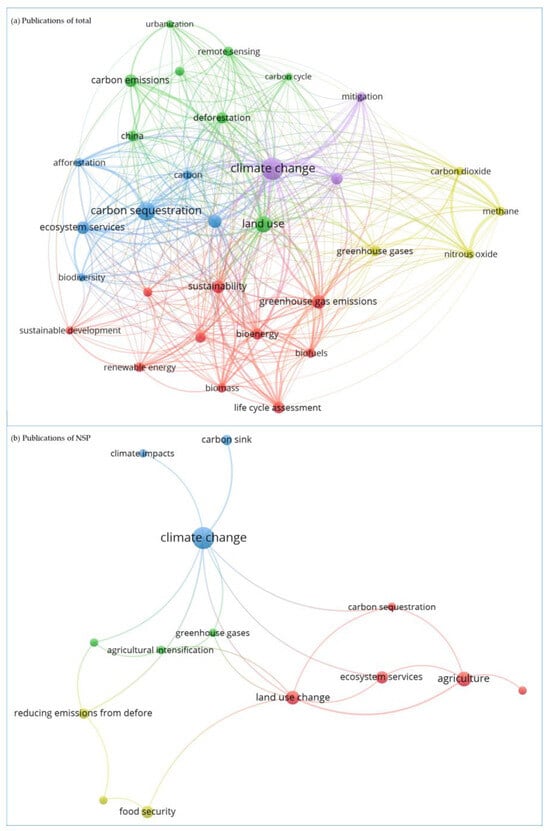 Keyword co-occurrence network map in LUCES research. (a) Total publications during 1991–2023; (b) publications of “NSP” during 1991–2023.