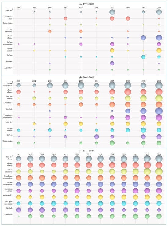 Based on DDA v7 software, we created a keyword bubble diagram of LUCES research which could grasp the evolution track of related hot topics, as shown in Figure 9. According to the different time zone diagram, the LUCES research was divided into three stages: the first one, the early stage of LUCES research (1991–2000), is shown in Figure 9 (a). The overall number of articles at this stage was relatively small. By 2000, the annual publications in LUCES research began to exceed 20. The clustering hotspots included land use, carbon sequestration, deforestation, greenhouse gases, carbon dioxide, CO2 emissions, carbon, climate change, biomass and agriculture. For instance, Swisher presented a comprehensive methodology and analyzed the CO2 storage of forestry projects, early in 1991 [45]. During the initial stage of research, scholars mainly focused on the evaluation of land carbon emissions and carbon sink. The second one, the slow growth stage of LUCES research (2001–2010), is shown in Figure 9b. It was very interesting to find that the annual number of publications in LUCES research exceeded 200 for the first time, which was 208 in 2010. During 2001–2010, the problems of land-based carbon source and sink from a global or national perspective has been concerning [46,47]. On the other hand, the researchers pointed out that biomass fuels instead of fossil energy could help reduce GHG emissions [48,49,50]. The clustering themes include land use, land use changes, deforestation, greenhouse gases, greenhouse gas emissions, carbon, carbon sequestration, carbon dioxide, climate change and biofuels. The third one, the rapid growth period of LUCES research (2011–2023), is shown in Figure 9c. And during 2011–2023, the annual number of publications in LUCES research showed a rapid growth. Meanwhile, it was also interesting to find that the annual number exceeded 400 (449) for the first time in 2020. In this study period, scholars have focused on the carbon sink from land use in different ecosystems, such as forests, grasslands, etc. [5,51]. In the meantime, the research on land use carbon sources and sink (including CO2 or carbon emission, carbon sink and carbon sequestration) from multiple perspectives, such as ecosystem service value, sustainable development, as well as carbon neutrality, have received increased attention [52,53,54,55]. Especially after 2015 and 2019, the research on SDGs (Sustainable Development Goals) and carbon neutrality were in full swing. During the study period (1991–2023), the clustering themes included land use change, ecosystem services, sustainability, carbon sequestration, greenhouse gas emissions, carbon emissions, life cycle assessment, climate change, biofuels and agriculture.