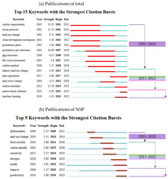 Burst detection is helpful to understand the future research topics. The top 15 and top 9 keywords with the strongest citation bursts were analyzed in total publications, as well as in “NSP”, during 2001–2023 (the red line means the strongest bursts), respectively (Figure 10a,b). It was found that in total publications, beginning during 2001–2021 and ending during 2012–2023, the top 15 emergent words included carbon sequestration, Kyoto protocol, land-use change, clean development mechanism, greenhouse gases, greenhouse gas emissions, GHG emissions, life-cycle assessment and carbon markets, those emergent words appeared in the slow growth stage (2001–2010); indirect land use change, Paris agreement, land cover change, carbon neutrality, nature-based solutions and machine learning appeared in the rapid growth stage (2011–2023) (Figure 10a). In addition, it was found that in publications of “NSP”, beginning during 2009–2020 and ending during 2011–2023, the emergent words included deforestation and land use change, and only these two emergent words appeared in the slow growth stage (2001–2010); and food security, carbon dioxide, sensitivity, nitrogen, model, impacts and productivity emergent words appeared in the rapid growth stage (2011–2023) (Figure 10b).