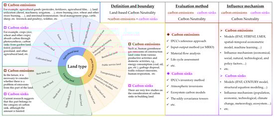 Firstly, the related literature was sorted out from the perspective of the definition and boundaries. From the comprehensive review, it was evident that there were different expressions and boundaries for land-based carbon emissions or carbon sink (here we took carbon storage or carbon sequestration and other similar concepts into the study of carbon sink) (Figure 11). For example, land-based CO2 emissions were emitted from agricultural land (e.g., agricultural inputs such as pesticides, fertilizers, agricultural film, diesel, machinery, irrigation, etc.; straw burning, such as rice, wheat and other straw burning, etc.; intestinal fermentation/fecal management, such as pigs, cattle, sheep, etc.; livestock and poultry, wildfire, etc.) and construction land (such as human greenhouse gas emissions of construction land which come from various productive activities and domestic activities, e.g., energy consumption, coal, oil, gas, etc.; garbage disposal, traffic exhaust emissions, human respiration, etc.) [8,9,10]. Land-based carbon sink came from sources such as crops (rice, wheat and other crops absorb carbon through photosynthesis, etc.; land-based carbon sink from crops varied in different regions, some of which were seasonal, even annual), garden land, forest, pastoral grassland and other agricultural land, etc. [11,12,13]. Although the above expressions were different, all of them referred to carbon emissions or sink generated using direct or indirect Land Use, Land-use Change and Forestry (LULUCF). Therefore, this study considered all of the above definitions and boundaries when formulating the retrieval formula of the research object. Reviewing the literature, this paper analyzed the basic progress in LUCES research. The main hotspots of LUCES research have shifted from solely considering carbon sink or carbon emissions to considering carbon neutrality.