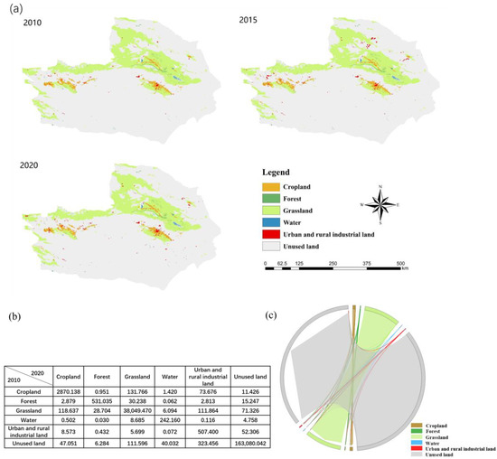 Spatial and temporal changes in land use types in the Tuha region, 2010–2020. (a) Land use types, 2010–2020; (b) transfer matrix of land use types, 2010–2020; and (c) changes in land type, 2010–2020.
