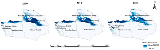 Changes in surface water yield are highly important for human survival and ecological stability and are directly related to surface runoff, soil properties, and vegetation growth. The results of this study showed a decreasing trend in water production in the Tuha region from 2010 to 2020 (Figure 3). In 2010, water production peaked at an average of 13.97 mm, while in 2015, the average was 13.51 mm; finally, in 2020, it dropped to 8.81 mm. The amount of water produced is influenced by a combination of topographic, geomorphological, climatic, and hydrological factors, which are influenced mainly by precipitation and potential evapotranspiration. Potential evapotranspiration is strong within the Tuha region, with potential evapotranspiration values of 3244.80 mm, 1083.35 mm, and 1115.61 mm occurring between 2010 and 2020. Lower precipitation and higher potential evapotranspiration resulted in significant differences in water production over time. In terms of spatial distribution, the areas with high water production values are mainly located in the oasis area of the Tuha region, southern Barkol, northeastern Yizhou district, western Yiwu county, and northern Gaochang district areas. In contrast, there is almost no water production in other desert Gobi Desert areas.