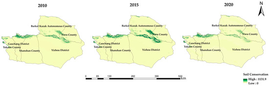 By simulating the amount of soil retained, we can intuitively and clearly understand the soil erosion situation in the Tuha area, which is highly important for effectively protecting and improving soil and water resources and giving full play to the economic and social benefits of soil and water resources. During the ten years from 2010 to 2020, soil retention in the Tuha region experienced an increasing and then a decreasing trend of 5.2 × 108 t, 7.3 × 108 t, and 4.08 × 108 t, respectively. The average soil retention during this period was 5.53 × 108 t, and Figure 4 shows that the highest value also exhibited an increasing and then decreasing trend. During the period from 2010 to 2015, the grassland land type in the Tuha region increased annually, while the unutilized land type decreased annually. For some soil erosion and desertification areas, priority measures for returning farmland to forest and grassland were implemented, and unutilized land was actively developed; thus, soil conservation showed an upward trend. However, between 2015 and 2020, the growth of urban and rural industrial and mining construction land was more significant, occupying the original forest land, grassland, and arable land, etc., resulting in a downward trend in soil retention from 2010 to 2020. In terms of spatial distribution, areas with high soil retention are located mainly on both sides of the Tian Shan range and in the southern part of Barkol. These areas have high vegetation cover and thus show strong soil retention capacity.