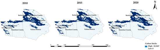 Spatial distribution of carbon stocks in the Tuha Region, 2010–2020.
