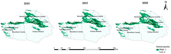Spatial distribution of habitat quality in the Tuha region, 2010–2020.