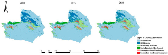 In this study, the coupling coordination development of the Tuha region was studied in depth by comparing the grid scale and county scale. Figure 9 shows that the spatial distribution characteristics of the coupling coordination degree of the Tuha region in 2010, 2015, and 2020 were basically the same. As unutilized land occupies a large proportion of the Tuha region, the coupling coordination degree of these regions generally indicates a type of serious disorder. In terms of spatial evolutionary trends, the mildly dysfunctional types were distributed mainly in the northwestern region of Barkol; however, with the implementation of government policies, the mildly dysfunctional types gradually evolved toward the endangered dysfunctional types, indicating that coupling coordination was moving toward coordinated development. The northern part of Turpan showed a staggered distribution of imminent dislocations and was barely coordinated in 2010, with a marked increase in the barely coordinated type in 2015, while maintaining a relatively stable trend in 2020. The distribution of intermediate-level coordination was relatively small in 2010, but the type of intermediate-level coordination increased significantly in the northeastern part of Hami Yizhou district and the southern part of Barkol county in 2015 and remained essentially stable in 2020. This situation indicates that the coupled and coordinated development of these areas between economic, social, and ecological systems has been optimized. Since the southern part of the Turpan region and the southern part of the Yizhou district are mostly bare land, these areas have typically been in a state of severe dislocation in the last 10 years.