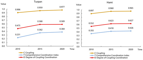The coupling coordination degree of the Tuha region in 2010, 2015, and 2020 exhibited consistent spatial distribution characteristics. The large area of unutilized land led to a generally serious dislocation in the region, with mild dislocation in the northwestern part of Barkol. With the promotion of government policies, dislocations gradually evolved to the verge of dislocation, and the degree of coupling coordination gradually increased. During the period from 2010 to 2020, the three major social, economic, and ecological systems of Turpan city and Hami city exhibited strong correlations, and the overall performance exhibited a smooth and coordinated development trend. The change curves of the comprehensive coordination index and the coupling coordination degree were similar, and both showed a continuous growth trend. The degree of coupled and coordinated development of Turpan city and Hami city as well as the districts and counties gradually increased, but Hami city was better compared with Turpan city, with the highest coupled and coordinated development occurring in Yizhou district of Hami city, and Gaochang district in Turpan city had the highest growth in coupling coordination.