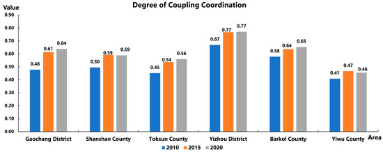 (2) The coupling degree of the social, economic, and ecological systems in the Tuha region is generally high and shows a trend of gradual increase, rising from 0.41–0.67 in 2010 to 0.46–0.77 in 2020, with the gap between different districts narrowing. Among them, the Yizhou district, as the central area of Hami city, exhibits the strongest coupling and coordination among the economic, social, and ecological dimensions, making it the region with the best coupling coordination degree in the Tuha area. Furthermore, the coupling coordination degree of the Gaochang district in Turpan city grew by 33.48% from 2010 to 2020, marking it as the area with the most significant and fastest growth. This remarkable increase is closely associated with measures taken in the past decade to balance the development of various systems in the Gaochang district. Nevertheless, the study period still saw a considerable proportion of severe imbalance stages, which is largely related to the uneven use of land resources in the Tuha region. To achieve coordinated development of the ecological environment and socioeconomic systems, it will be necessary to further explore the development potential of land use and improve the efficiency of land resource utilization in the future.