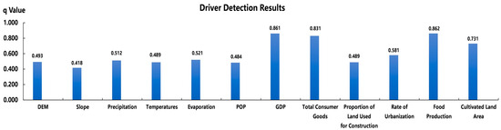 Geodetector is a novel spatial statistical method developed by Wang et al. to detect spatial heterogeneity and quantify the effects of various drivers [67]. In this study, we used geodetectors to quantitatively identify the degree of action of each influencing factor to compare the effects on the coupled social–economic–ecological coordination value (q) and to analyze the factors affecting the degree of coupled coordination. Its expression is as follows: