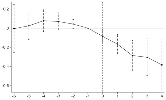Differences in resource endowment and economic development between pilot and non-pilot provinces may affect provincial carbon emission intensity to different degrees in trends over time, which may cause estimation bias in the final regression results. In order to control for the effect of differences in characteristics between provinces, an interaction term between the control variables and the time trend is added to the baseline regression so as to exclude the effect caused by the time trend of these characteristic variables. The results obtained are presented in column (5) of Table 3. In addition, in order to mitigate potential bidirectional causality, the control variables in the benchmark regression are borrowed and lagged by one period in their entirety, replacing the original control variables in the benchmark model in order to avoid the endogeneity problem, and the results obtained are shown in column (6) of Table 3. According to the results in the two columns of the table, the estimated coefficients of remain significantly negative at the 1 percent level, supporting the results of the benchmark regression.