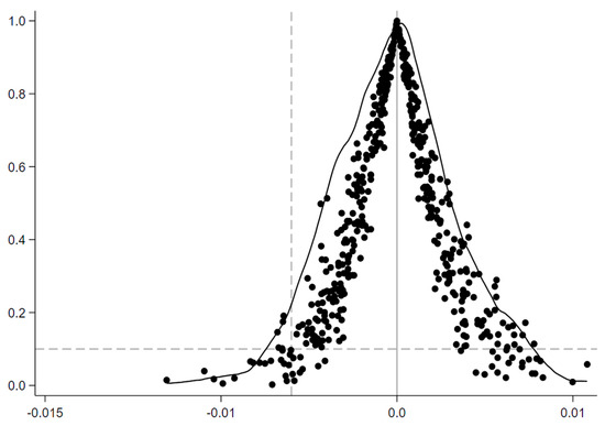 In order to ensure that the empirical results on the reduction in carbon emission intensity in agriculture are caused by the implementation of CRFS and to exclude other unknown factors from interfering with the empirical results, this paper further conducts a placebo test. The placebo test is a regression in the sample by randomly selecting any dummy group. In this paper, we conduct a random sample of 500 out of the panel data of 30 provinces and regress it on model (1). Figure 2 reports the results of the placebo test. The distribution of the estimated coefficients unfolds roughly in the centre of 0, and the mean value corresponding to 500 times the estimated coefficients is −0.003, which is very close to 0. It is far away from the true estimated coefficients in this paper, i.e., far away from the vertical line, which implies that the estimated coefficients of the placebo test are much smaller than the true values, and initially proves the effect of the policy of CRFS on the reduction in the intensity of carbon emissions in agriculture. In addition, in the placebo test, only the estimated coefficient of a 0.2 percent proportion of the sample is larger than the true value of −0.007 in the benchmark regression, with a very small probability of being similar to the results of the benchmark regression in this paper, thus providing strong evidence that the implementation of the CRFS policy has an effect on the increase in total factor productivity in agriculture.