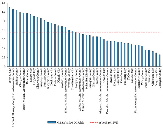 Drawing on the input–output panel data of 44 counties from 2014 to 2020, this study estimated the AEE of counties in Liaoning Province using the S-SBM model, including UOs. To further explore the differences in the overall efficiency values of different county units, this study drew a map of the average AEE of each county (Figure 1). As depicted in Figure 1, the average AEE of Liaoning Province was relatively high, but the AEE of the counties was mostly below or close to the average level. To understand the AEE sequence each county in the province, this study further calculated the average AEE of each county from 2014 to 2020 and compared the average AEE of each county with the average AEE level of counties in the province. The average AEE of Liaoning Province reached 0.76, indicating that the average AEE of the counties in the province was relatively high. However, the AEE of 57% of the counties was below or close to the average level, with significant room for enhancement. The top five counties with the highest AEE are Beipiao City, Kalaqin Left-wing Mongolian Autonomous County (Kalaqin), Tieling County, Changtu County, and Benxi Manchu Autonomous County (Benxi). This shows that the agricultural resource input and benefit output in these counties are relatively coordinated, and the results of environmental pollution control are obvious. The AEE of counties such as Suizhong County, Gaizhou City, Xingcheng City, Fengcheng City, and Changhai County were all lower than 0.38, indicating that these counties should consider the control of diffused agricultural pollution and increase investment in environmental protection. Overall, the AEE of the counties shows a certain degree of differentiation. Some counties still have ample space for improvement in AEE, and the spatial and structural configurations of their factor inputs need to be further optimized.