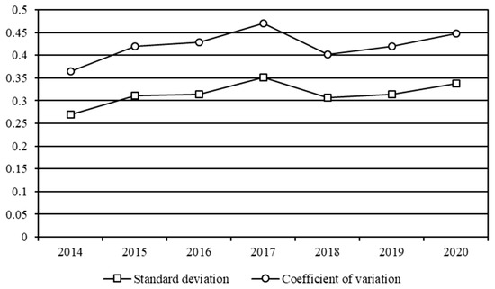The differences in AEE among counties in Liaoning Province generally showed an upward oscillating pattern, and the development of AEE showed an uneven state. To examine the dynamic evolution of differences in AEE among counties, we divided the standard deviation of AEE in counties for each year by the arithmetic mean to obtain the difference coefficient of AEE (Figure 2). The larger the coefficient, the greater the difference in AEE among counties. As shown in Figure 2, the standard deviation and coefficient of variation in county-level AEE showed a fluctuating upward trend from 2014 to 2020. The coefficient of variation in AEE was 0.365 in 2014 and 0.448 in 2020, indicating an increase of 22.74% during this period. This shows that, during this period, the differences between counties in terms of ecological environment management and input factors gradually increased. While pursuing agricultural development, some counties have neglected the optimal allocation of input factors and the control of agricultural environmental pollution.