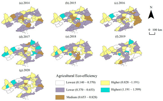 To better reveal the spatiotemporal evolution characteristics of AEE changes in Liaoning Province, this study used Arcgis10.5 software to draw a spatial distribution map of AEE based on the AEE estimation results from 2014 to 2020. Based on the AEE data of 2017, the natural breakpoint method was used to divide it into five categories from high to low, and by analogy to the other two years (Figure 3) [38,39,40], we then analyzed the spatiotemporal pattern characteristics of the AEE of counties in Liaoning Province.