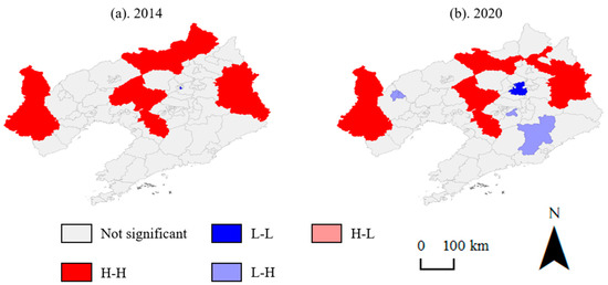 LISA of AEE in counties in Liaoning Province in 2014 and 2020.