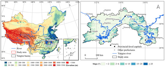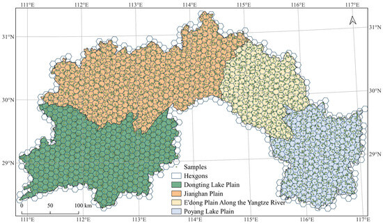 The Middle Yangtze Plain spans three provinces in central China: Hunan, Hubei, and Jiangxi, between 28° N and 31.5° N latitude and 111° E–117° E longitude (Figure 1). This area is characterized by a subtropical monsoon climate. The region receives average annual precipitation of 950–1800 mm, with an average annual temperature of 10–18 °C and average relative humidity of 75–82%. The annual sunshine hours range from 1400 to 2000. The study region is a typical alluvial plain, including the Dongting Lake Plain, Jianghan Plain, E’dong Plain Along the Yangtze River, and Poyang Lake Plain. The soil is fertile, with loose texture, primarily composed of human-modified soil, strongly leached soil, and alluvial soil. The terrain is predominantly low and gently sloping, with approximately 86% of the region below 100 m in elevation and 85% having a slope less than 4°. Moreover, this area boasts the largest number of lakes in China, spanning a total area of 2 million hectares, constituting 16.9% of the region.