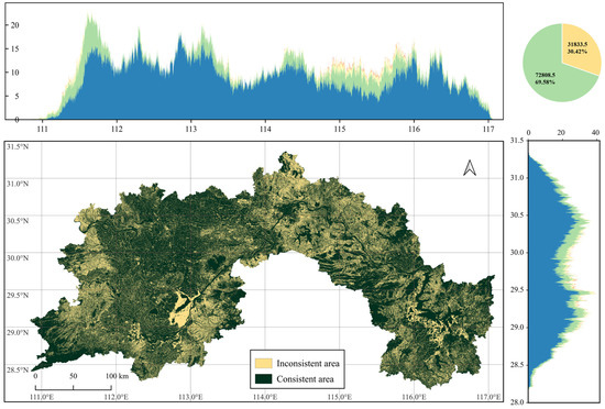Around 69.58% of GLAD and the CLCD were inconsistent. In regions with inconsistencies, the primary focus is on Wuhan City in Hubei, Yueyang City, and the northern part of Changde City in Hunan. Additionally, concentrated areas of inconsistency are found around Dongting Lake, Poyang Lake, Wuhan City, and the along the Jianghan Plain in eastern Hubei. Statistical data from county-level administrative regions reveal areas with notably high inconsistency between the two, including Yueyang County (1321.7 km2), Taoyuan County (971.0 km2), and Li County (825.5 km2) in Hunan; Huangpi District (1260.4 km2), Jiangxia District (905.0 km2), and Xishui County (873.6 km²) in Hubei; and Poyang County (1038.8 km²) in Jiangxi.