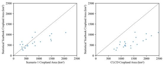 In general, scenario 1 aligned more closely with the 2011 yearbook statistics, whereas the CLCD tended to provide higher estimations (Figure 5). The cropland areas for the four prefectures in 2011 were 2065.20 km2, 1204.40 km2, 413.90 km2, and 6586.50 km2, respectively. Scenario 1’s estimated cropland areas closely matched these figures, measuring 2089.82 km2, 592.49 km2, 442.95 km2, and 7734.35 km2, with minimal differences except for Huangshi. However, the CLCD’s estimates significantly surpassed the statistical data, measuring 5881.52 km2, 2154.59 km2, 1080.52 km2, and 11,250.21 km2, respectively. At the county level, scenario 1 occasionally overestimated cropland areas in certain regions, but overall, most areas aligned well with the yearbook statistics (scatter points close to the y = x line). Conversely, the CLCD consistently overestimated cropland areas at the county level, with scatter points consistently below the y = x line.