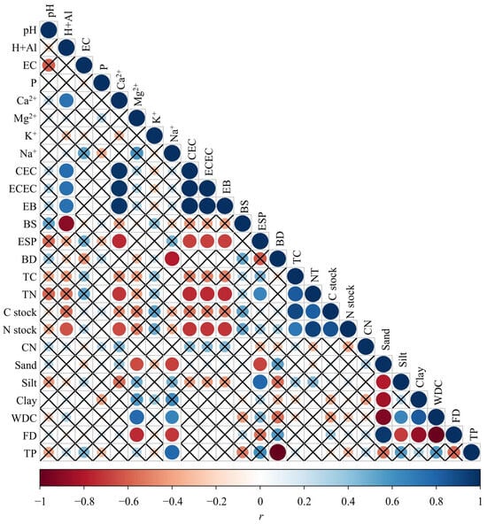 Pearson correlation coefficients between soil indicators. The color of each circle indicates the correlation direction—blue for positive, red for negative. The intensity of the color corresponds to the correlation strength: the darker the shade, the stronger the correlation. The circle’s size denotes the correlation coefficient’s magnitude, with larger circles representing higher absolute values. The “X” denotes a non-significant correlation.