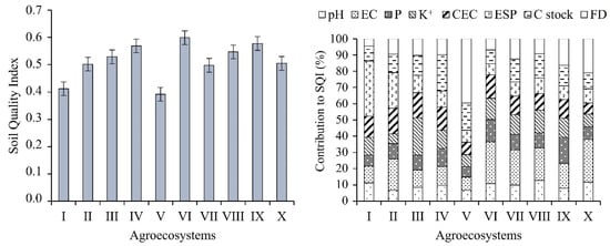 The SQI and the individual contribution of selected minimum data set indicators are presented in Figure 3. Except for agroecosystems V and VI, with strong (0.60) and weak (0.39) SQI values, respectively, the other agroecosystems showed moderate SQI values (0.40–0.59). The highest SQI values were observed in agroecosystems IV, VI, VIII, and IX. Nonetheless, these agroecosystems statistically differed from only agroecosystems I and V (p < 0.05). EC, available P, pH, K+ values, and C stock are essential attributes in agroecosystems with higher SQI values. At the same time, the FD strongly contributes to the agroecosystem with the lowest SQI values (Figure 3).