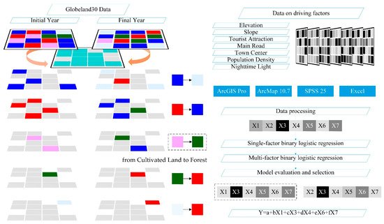 Second, in terms of acquiring the response variable and the explanatory variables for analyzing the impact mechanism of the conversion from cultivated land to forests, the data processing involved several steps. To acquire response variable, with the help of GIS software (ArcMap 10.7 and ArcGIS pro 10.3), following steps were carried out: (1) the Spatial Analyst Tool named Raster Calculator was applied to define the attribute value of the spatial unit that changed within the study area as 1 and the attribute value of the spatial unit that did not change as 0; (2) within the spatial range of the spatial unit with an attribute value of 1, the Spatial Analyst Tool named Extract by Attributes was applied to obtain the raster data of cultivated land change to other LULC types; (3) the Conversion Tool named From Raster to Polygon was applied to convert the raster data into vector data; (4) random point data were created within the spatial extent constrained by the vector data; (5) the Spatial Analyst Tool named Extract Multi-values to Points was applied to assign land use type attributes to the random point data in the initial and final years, where the attribute for conversion of land use type from cultivated land to forests is defined as 1 and the attribute for conversion of land use type from cultivated land to other LULC types is defined as 0. To acquire explanatory variables (see more in Table 1), with the help of the GIS software (ArcMap 10.7 and ArcGIS pro 10.3), following steps were carried out: (1) the Spatial Analysis Tool called Slope Analysis Tool was used to generate slope data at 30 m resolution based on the DEM data; (2) the Spatial Analyst Tool called Euclidean Distance was used to generate data, including the distance to the nearest main road, the distance to the nearest tourist attraction, and the distance to the nearest town center; (3) another Spatial Analyst Tool named Raster Calculator was used to generate data, including the change in population density and nighttime light; (4) the values of the explanatory variables were assigned to the attribute table of the random point data with the help of the Spatial Analyst Tool named Extract Multi-values to Points.