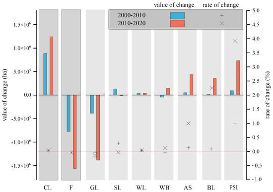 Value of change and rate of change in area for each LULC type in each decade from 2000 to 2020 within the LMRB. CL means cultivated land, F means forest, GL means grassland, SL means shrubland, WL means wetland, WB means water body, AS means artificial surface, BL means bare land, PSI means permanent snow and ice.