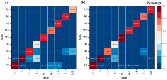 Land use transition probability matrix within the LMRB during: (a) 2000–2010; (b) 2010–2020. CL means cultivated land, F means forest, GL means grassland, SL means shrubland, WL means wetland, WB means water body, AS means artificial surface, BL means bare land, PSI means permanent snow and ice.