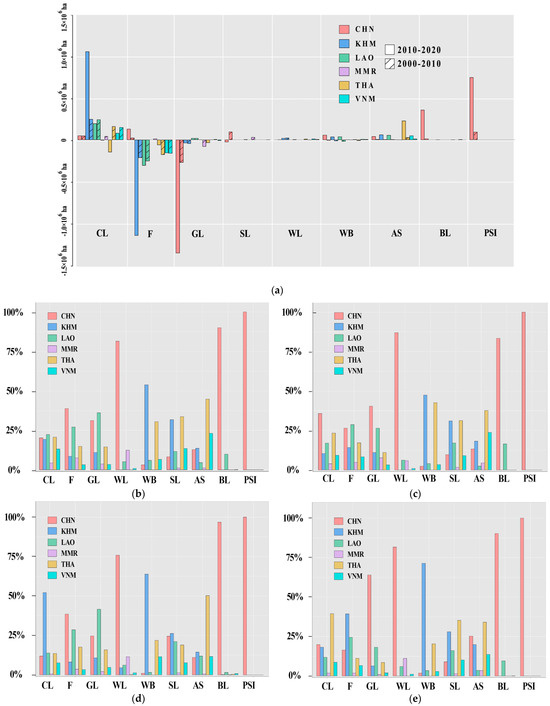 Patterns of national differentiation in terms of: (a) net change for each LULC type during 2000–2020; (b) gain for each LULC type from 2000 to 2010; (c) loss for each LULC type from 2000 to 2010; (d) gain for each LULC type from 2010 to 2020; (e) loss for each LULC type from 2010 to 2020. CL means cultivated land, F means forest, GL means grassland, SL means shrubland, WL means wetland, WB means water body, AS means artificial surface, BL means bare land, PSI means permanent snow and ice. CHN: China; KHM: Cambodia; LAO: Laos; MMR: Myanmar; THA: Thailand; VNM: Vietnam.