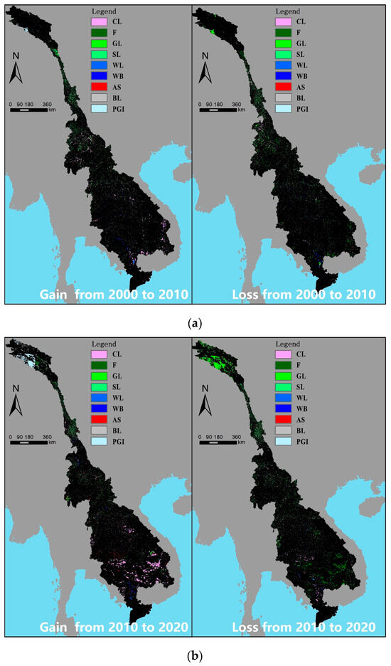 LUCC across the LMRB: (a) gain and loss from 2000 to 2010; (b) gain and loss from 2010 to 2020. CL means cultivated land, F means forest, GL means grassland, SL means shrubland, WL means wetland, WB means water body, AS means artificial surface, BL means bare land, PSI means permanent snow and ice.