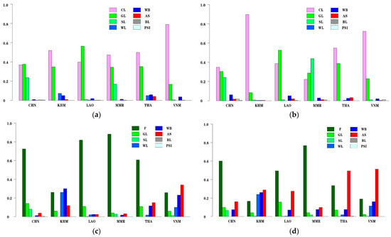 The probability of conversion from forests to other LULC types during: (a) 2000–2010; (b) 2010–2020. The probability of conversion from cultivated land to other LULC types during: (c) 2000–2010; (d) 2010–2020. CL means cultivated land, F means forest, GL means grassland, SL means shrubland, WL means wetland, WB means water body, AS means artificial surface, BL means bare land, PSI means permanent snow and ice. CHN: China; KHM: Cambodia; LAO: Laos; MMR: Myanmar; THA: Thailand; VNM: Vietnam.
