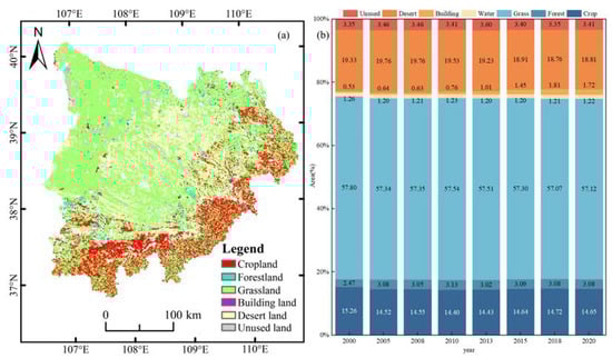 (a) Land use types that have not changed from 2000 to 2020. (b) The percentage of different land utilization categories in various years.