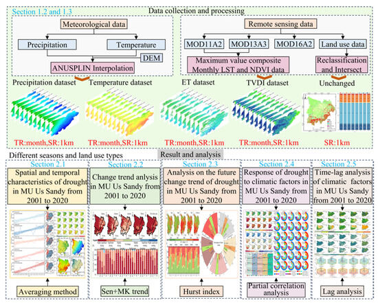 Therefore, the objectives for this research were to (1) quantify the extent of drought with autocorrelation of TVDI series data and the effect of climatic factors (including evapotranspiration) on drought in MUSL; (2) analyze the features of the seasonal and annual drought’s temporal and spatial spread, the TVDI’s variations trends between 20a and the future for various kinds of land use, and the relationship between seasonal drought and seasonal climatic parameters; and (3) explore the reasons for the greatest drought in the spring, the predominance of dry to wet summers and the predominance of persistent drying the whole year in the future, as well as the mechanisms by which TVDI is influenced by climatic factors for multiple types of land use. These objectives aim to provide academic support and a foundation for decision-making regarding the development of agriculture, animal husbandry, and drought early warning systems in MUSL.