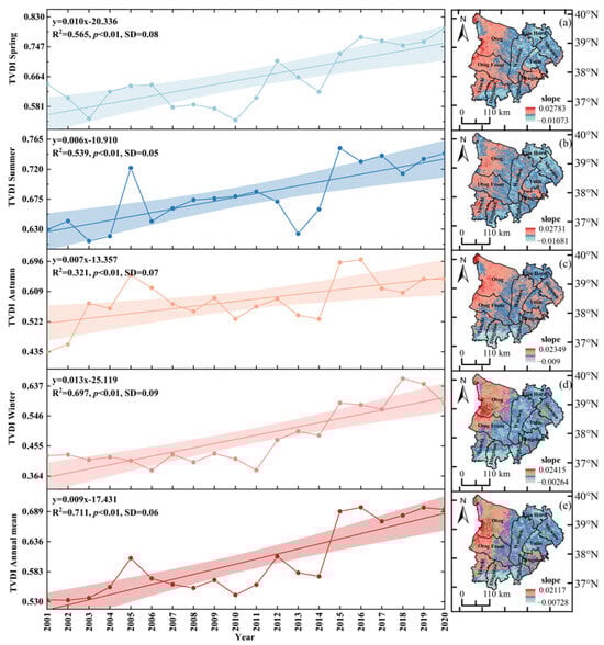 Geographical and temporal TVDI trends in MUSL seasons. (a) Spring, (b) summer, (c) autumn, (d) winter, (e) annual mean.