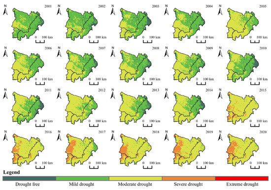 - From 2001 to 2020, TVDI (mean value 0.6) was greater for its west and smaller for its east. Drought severity varies by season, with the order being spring > summer > autumn > winter. Summer had the lowest growth rate (0.006/a, R2 = 0.539), while winter exhibited the highest (0.013/a, R2 = 0.697).