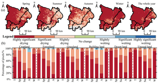 (a) Types of trends in drought changes and (b) trends in the significance for various utilizing land categories in MUSL (2001–2020). (T) The whole year; (Sp) spring; (Su) summer; (A) autumn; (W) winter.