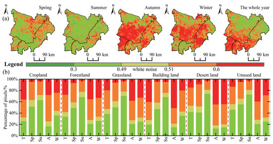 (a) Spatial Hurstexponentin different seasons and (b) percentage of Hurst exponentpixels for different land use types in MUSL (2001–2020). (T) The whole year; (Sp) spring; (Su) summer; (A) autumn; (W) winter.