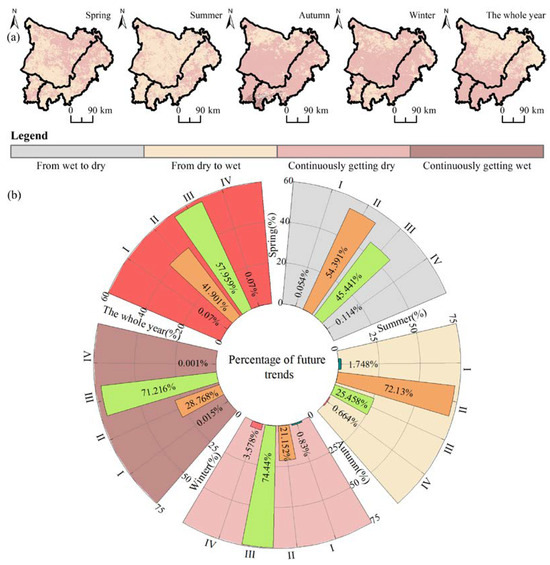 (a,b) Future trends in drought and percentage of future trends in MUSL. (I) From wet to dry. (II) From dry to wet. (III) Continuously becoming dry. (IV) Continuously becoming wet.