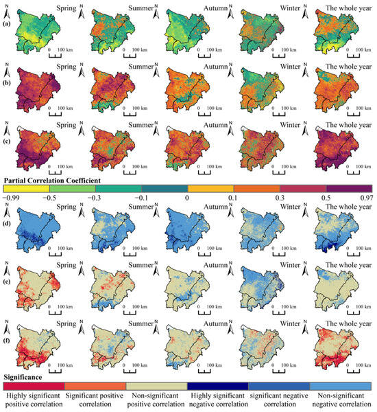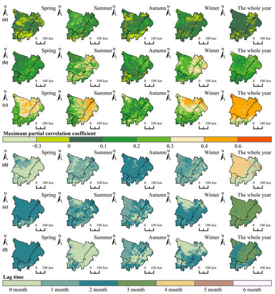 The greatest partial correlation value is and its lag time is . The partial correlation values of TVDI are , , , ……, , and for the current month, 1 month forward, 2 months forward, and months forward, respectively. When , the lag time is months. In this study, the seasonal division scale is based on 3 months; that is, the seasonal scale only calculates the partial correlation coefficient forwarded to 2 months, and the whole year scale calculates the partial correlation coefficient to 6 months forward.