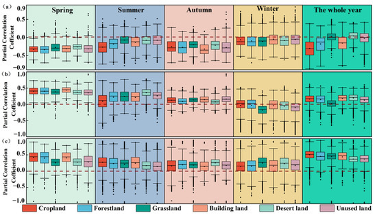 TVDI partial coefficients associated with (a) precipitation, (b) temperature, and (c) ET across various land utilization categories in different seasons in MUSL from 2001 to 2020.