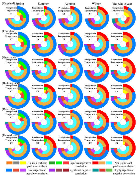 Figure 11 and Figure 12 depict the partial correlation values between spring precipitation and TVDI for the six land use types, primarily ranging from −0.44 to −0.18, with over 80% exhibiting an insignificant negative correlation. Forestland exhibited a slightly more significant negative correlation than the other five types. In summer, compared to spring, the partial correlation coefficients were considerably lower and more dispersed, indicating that TVDI responded more strongly to precipitation in spring than in summer. The pattern of partial correlation values in fall mirrored that of summer, except for forestland, which showed roughly an 18% significant negative correlation with building land. Winter sea-sons were characterized by predominantly non-significant negative correlations, with partial correlation coefficients for grassland, desert land, and unused land closer to those of summer, while all others were lower than the other three seasons. Non-significant negative correlation pre-dominated throughout the whole year, except for building land and unused land. Spring TVDI exhibited the strongest partial correlation values with temperature among the six categories, while summer desert land showed greater partial correlation values than the other five types. Correlation coefficients of different types in autumn were concentrated above 0.01, with more stable fluctuations than in summer. In winter, the correlation between different land types across seasons except grassland was minimal, with the lowest value of 0.02 observed for the correlation coefficient between grassland and temperature over the course of the year, indicating that grassland in winter and the whole year is not sensitive to temperature. Partial correlation coefficients between TVDI and ET for all land types except desert land in autumn exhibited a decrease followed by an increase throughout all seasons and the whole year, with trough and peak positions in autumn and the whole year, respectively. The whole year averaged higher correlation coefficients across various land types than the four seasons, with less variability observed among the same land use types. TVDI and ET exhibited an insignificant positive association in both seasons and the whole year.