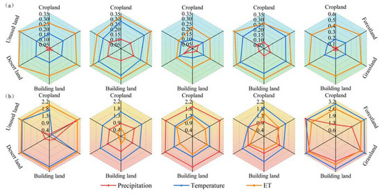 The greatest biased correlation values (between 0.16 and 0.51) of ET with various land use categories are much bigger than those of temperature and precipitation (Figure 14a). ET has the strongest impact on desert land in the spring and the whole year, while the weakest impact is on cropland. Figure 14b indicates that several land utilization patterns exhibit shorter seasonal lag times to precipitation in summer and fall, with average lag times ranging between 0.1 and 0.9 months. Forestland has the fastest response to temperature in spring, and various land use types are more sensitive to ET in the rest of the seasons, with the average lag time ranging between 0.1 and 1.2 months; all land use types were slowest responsive to temperature in summer and winter, while spring and autumn have the weakest sensitivity to ET and precipitation, respectively. On annual scale, cropland, forestland, building land, and desert land responded fastest to precipitation, and grassland and unused land responded fastest to ET; the response time to precipitation in descending order was desert land (2.7 months), building land (2.3 months), forestland (1.7 months), and cropland (1 month), indicating that cropland was the fastest to respond to precipitation, while desert land was the slowest; the response time to ET in descending order was grassland (2.5 months) and unused land (2.4 months), and then unused land had the fastest response time to ET. With the exception of abandoned land, which has an average lag time of three months (0.18 SD) to temperature, other land use types have the largest lag times. For every type of land, the temperature response time was longer than ET.